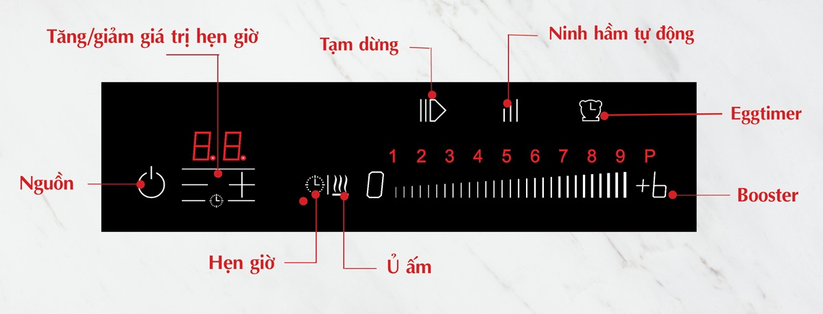 Ninh hầm tự động: Khi kích hoạt tính năng này, bếp sẽ được đẩy lên nấu ở mức công suất cao nhất (mức 9) trong khoảng thời gian từ 1-7 phút, sau đó sẽ tự động chuyển về mức công suất nấu thấp được lựa chọn ban đầu. Tính năng này được sử dụng tiện lợi khi cần nấu các món ninh hầm thời gian lâu.