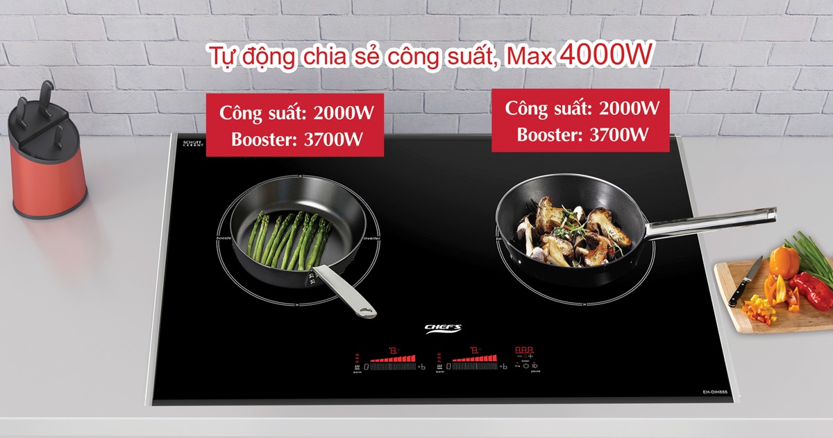 - Có tính năng tự động chia sẻ công suất, tối đa 4000W. Khi sử dụng đồng thời 2 vùng nấu, nếu tổng công suất đang đạt 4000W, khi một vùng nấu tăng công suất thì vùng nấu còn lại sẽ tự động giảm để đảm bảo duy trì ở mức công suất tối đa. Điều này giúp bảo vệ nguồn điện, bảo vệ bếp và tăng tuổi thọ cho bếp.