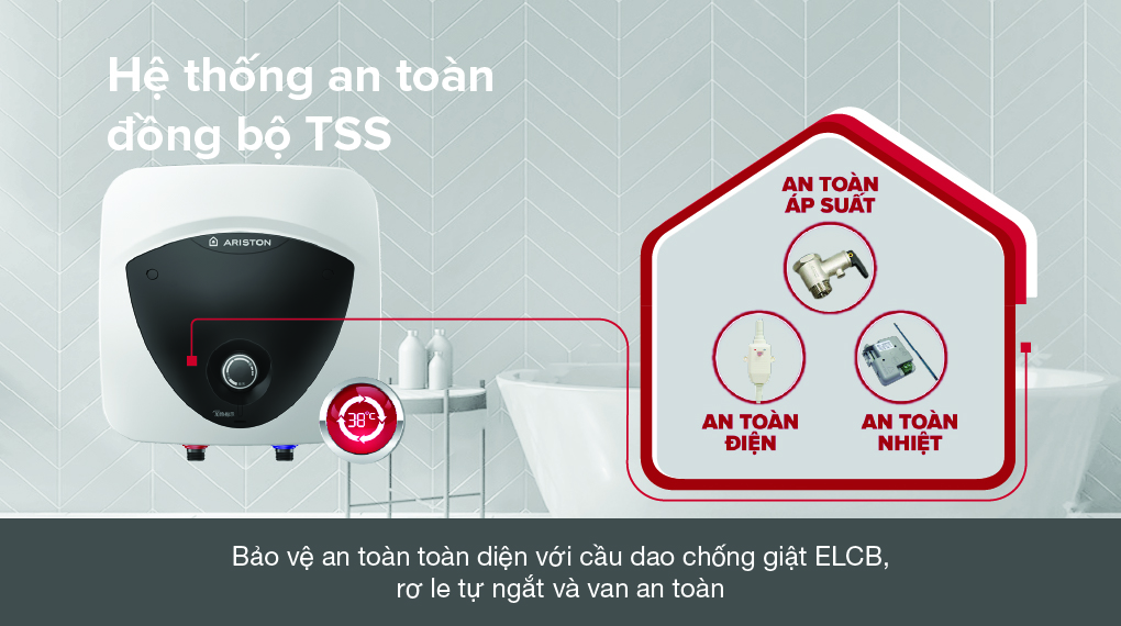 - Máy nước nóng gián tiếp Ariston được trang bị hệ thống chống giật, chống bỏng TSS bao gồm: