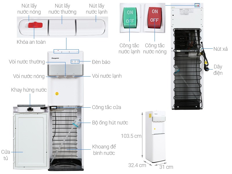 - Cây nước nóng lạnh Kangaroo thiết kế gọn, đẹp, màu trắng thanh lịch, hài hòa với không gian nội thất trong nhà, văn phòng,...tạo điểm nhấn cho không gian dùng.