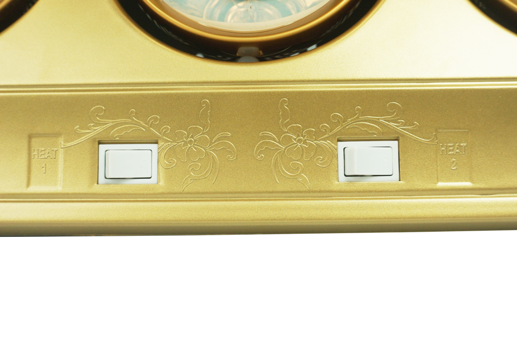Đèn sưởi nhà tắm H&E COOK 3 bóng HE03D với gam màu vàng thời thượng cùng hoa văn trang nhã mang đến tính thẩm mỹ cho không gian nhà tắm.
