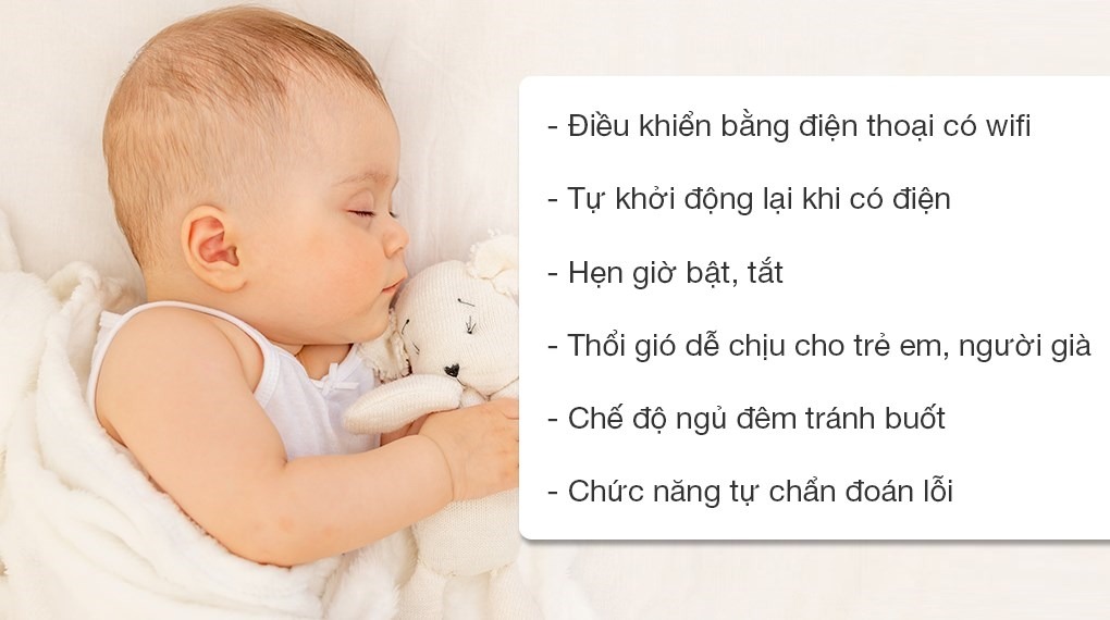 Điều khiển bằng điện thoại, có wifi Hẹn giờ bật, tắt Công nghệ Gold-Fin chống ăn mòn Chức năng tự chẩn đoán lỗi Thổi gió dễ chịu (cho trẻ em, người già) Chế độ ngủ đêm tránh buốt Tự khởi động lại khi có điện Chức năng tự làm sạch |