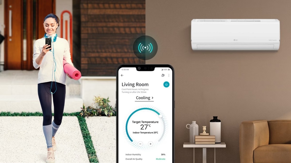 - Máy lạnh có thể kết nối wifi và cho phép người dùng điều khiển từ xa thông qua ứng dụng LG ThinQ trên smartphone. Vậy nên người dùng có thể chủ động điều khiển, kiểm soát hoạt động của máy lạnh mọi lúc, mọi nơi.