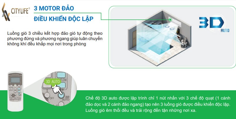 + Phân phối gió tự động 3 chiều, giúp luồng gió có mặt ở bất cứ ngóc ngách nào trong căn phòng, làm mát đồng đều không gian phòng, giúp bạn thoải mái tận hưởng không gian mát lạnh chỉ với một nút bấm.