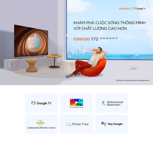 Google Tivi Coocaa 4K 65 inch 65Y72 với nhiều tính năng ưu việt với các đặc điểm chính như: Màn hình tràn viên không giới hạn, tivi độ phân giải 4K Ultra HD cực sắc nét, âm thanh vòm chuẩn Dolby Digital và những tính năng giúp bảo vệ sức khỏe các thành viên trong gia đình như Eye Care hay điều khiển kháng khuẩn.