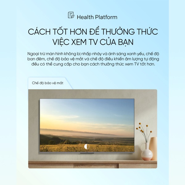 - Màn hình thân thiện với mắt: Coocaa 70C9 sử dụng màn hình có khả năng giảm tình trạng nhấp nháy (Flicker Free) và giảm ánh sáng xanh nằm trong tần số có thể gây mỏi mắt (Low Blue Light).