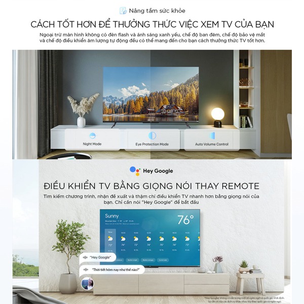 Chỉ với câu lệnh "OK Google" là bạn có thể ra lệnh chiếc tivi yêu dấu này. Thực hiện các thao tác đơn giản mà không cần remote vật lý. Bạn có thể bật, tắt tivi; chuyển kênh; tăng âm lượng; theo dõi thời tiết và nhiều tính năng nổi bật khác