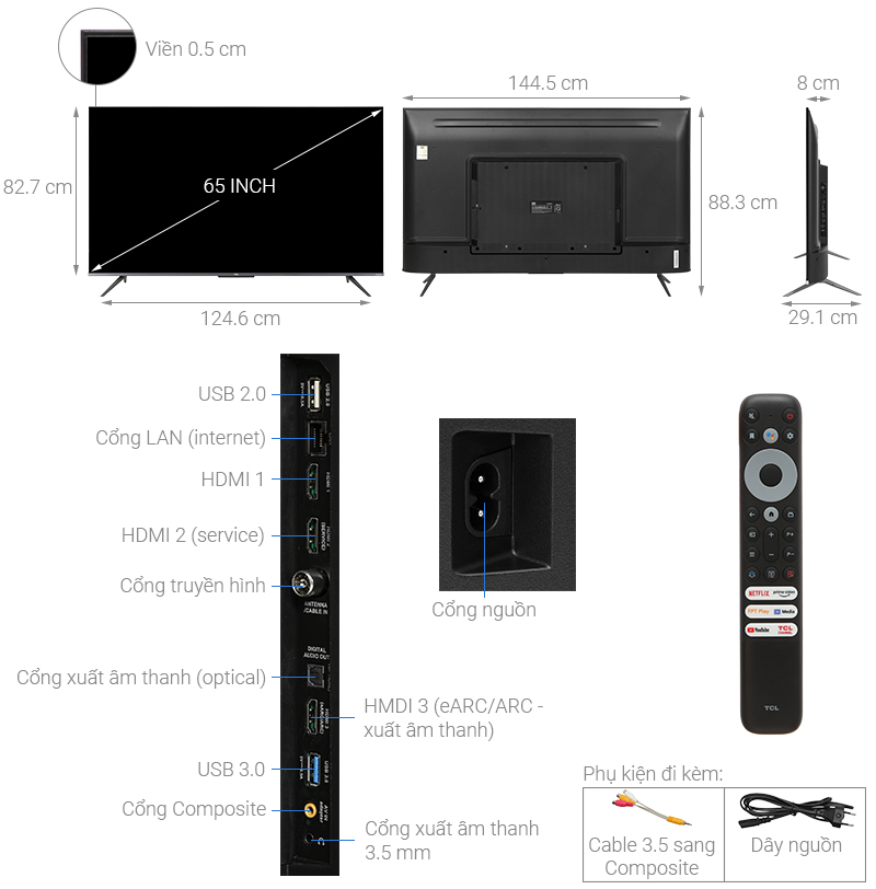 | Cổng nhận hình ảnh, âm thanh | 3 cổng HDMI có 1 cổng HDMI eARC (ARC), 1 cổng Composite |