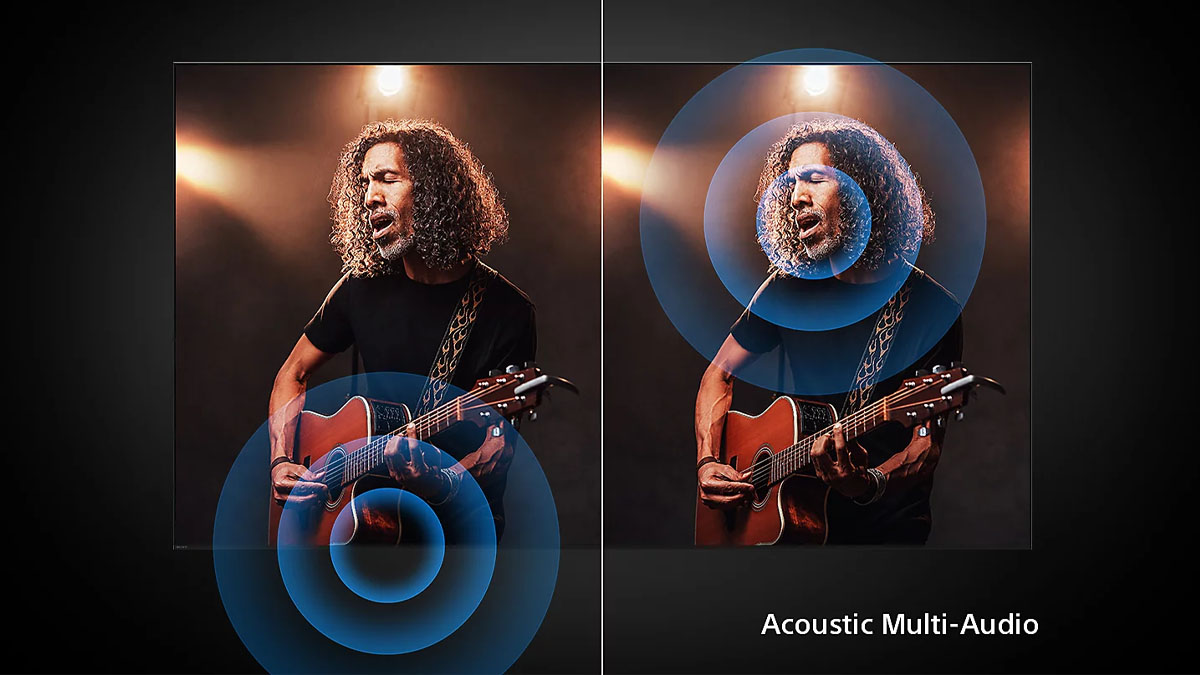 Với sự hỗ trợ của Acoustic Multi-Audio, âm thanh trình diễn từ tivi sẽ khớp chính xác với vị trí của nguồn phát trên hình ảnh. Nhờ đó, người nghe không chỉ được thưởng thức những bữa tiệc âm nhạc sống động mà còn ấn tượng, sinh động hơn gấp nhiều lần so với những dòng tivi thông thường chỉ phát nhạc từ hệ thống loa bên dưới màn hình.