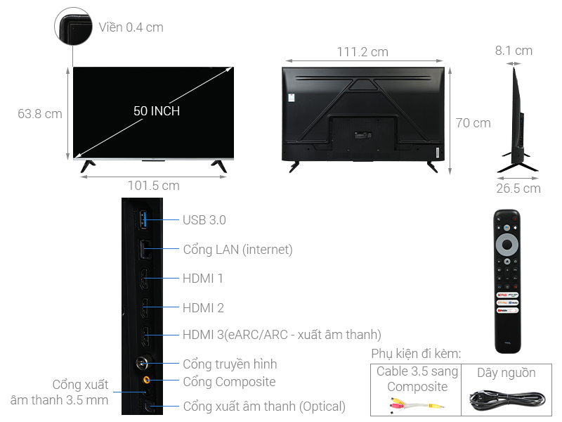 | Cổng nhận âm thanh, hình ảnh | 3 cổng HDMI có 1 cổng HDMI eARC (ARC), 1 cổng Composite |