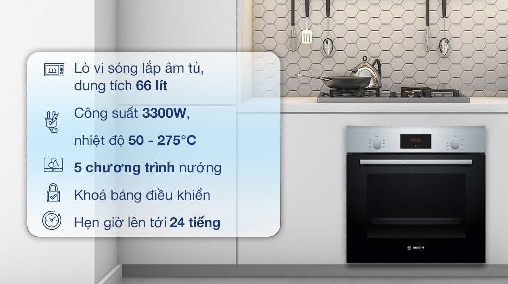 - Lò nướng âm Bosch 66 lít HBF133BS0A có công suất nướng 3300W, nhiệt độ lò 50 - 275°C, hẹn giờ lên đến 24 tiếng, giúp các món nướng chín ngon.