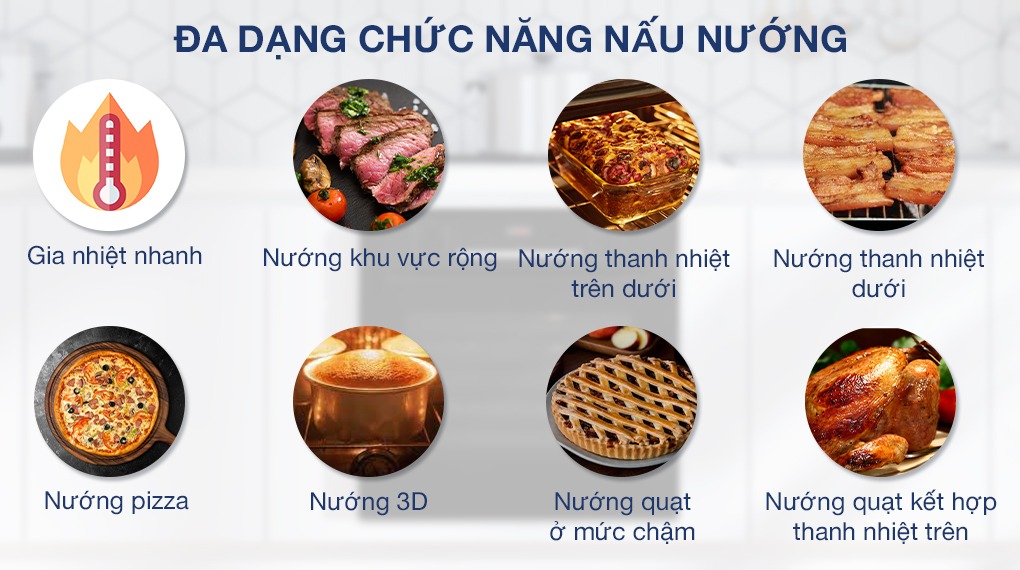 Nướng 3D - 3D Hot air: Quạt đối lưu phân phối nhiệt từ bộ phận làm nóng vòng trong bảng điều khiển phía sau và xung quanh khoang nấu, thích hợp để nướng bánh, nướng thịt trên một hoặc nhiều cấp độ.