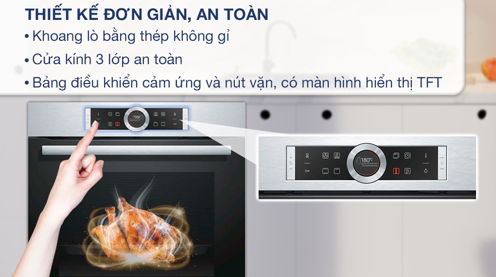 - Lò nướng âm Bosch 71 lít HBG633BS1A có công suất nướng 3600W, nhiệt độ lò 30 - 300°C, hẹn giờ lên đến 24 tiếng, giúp các món nướng chín ngon.