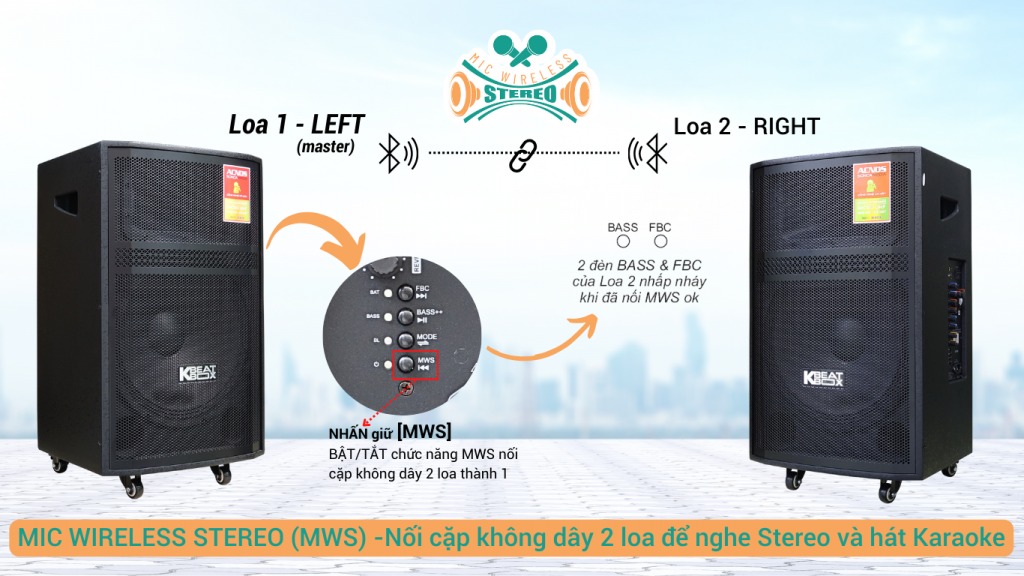 Với công nghệ MIC WIRELESS STEREO (MWS), hệ thống cho phép kết nối 2 loa và mỗi loa có khả năng phát tín hiệu độc lập cho cả kênh bên trái và bên phải. Quy trình hoạt động bắt đầu với việc truyền tín hiệu từ kênh bên trái và bên phải (LEFT - RIGHT) đến 1 loa. Loa này sau đó chỉ phát tín hiệu bên phải và chia sẻ tín hiệu bên trái cho loa còn lại để tạo ra âm thanh không dây Stereo.