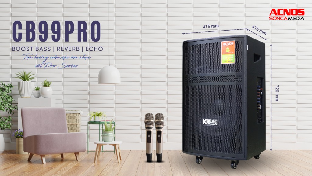 - ACNOS CB99PR0 được thiết kế Thùng gỗ sơn màu đen, mặt lưới đen gắn kèm bánh xe dễ dàng di chuyển. Hệ thống loa bao gồm 1 loa Bass 4 tấc (40cm) và 1 loa Treble cho âm thanh mạnh mẽ, trầm ấm. Công suất PMPO lên đến 450W . Micro UHF vỏ nhôm cao cấp không dây nhẹ hơi, nâng giọng hát karaoke chuyên nghiệp.