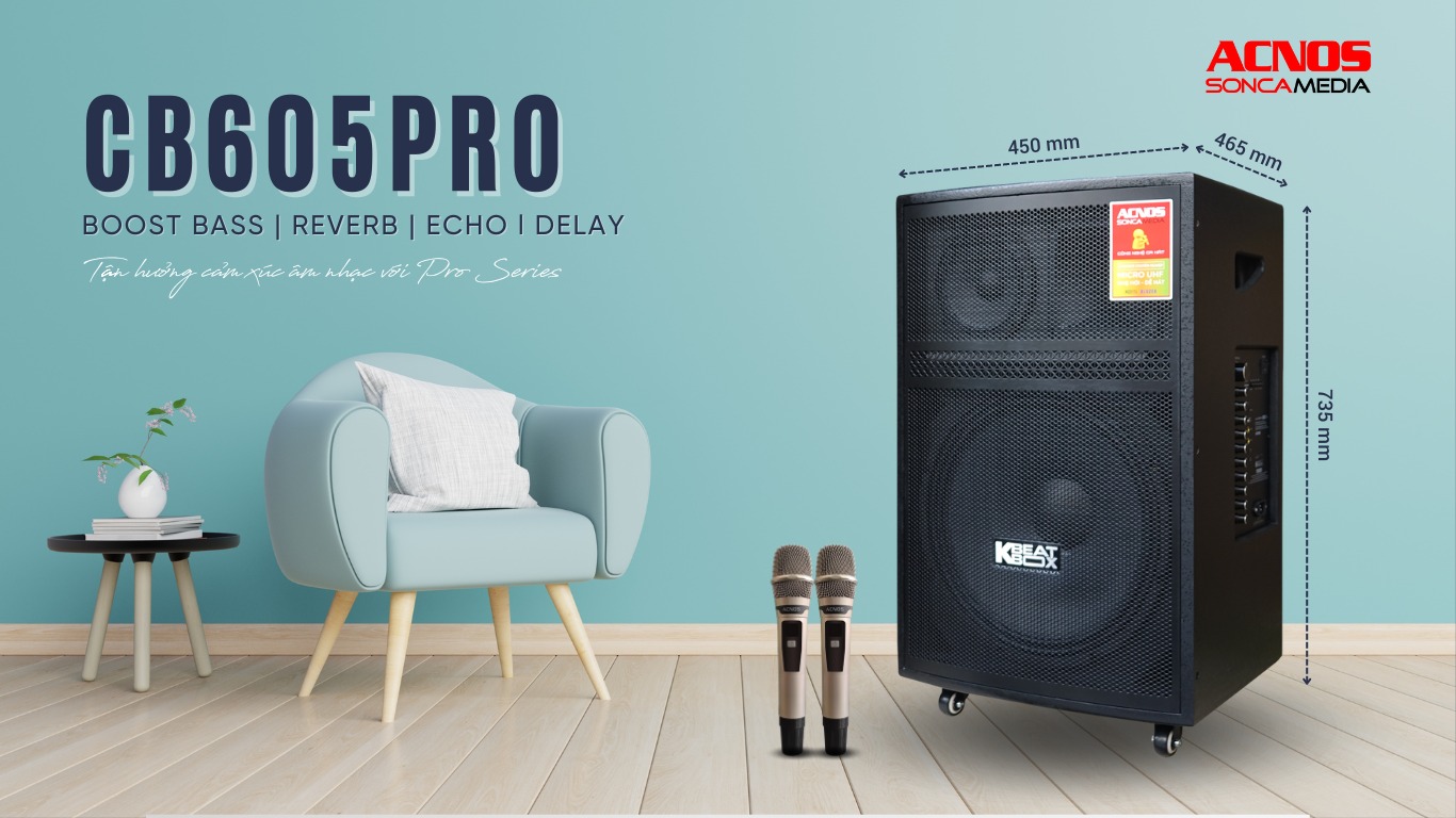 ACNOS CB605PRO được thiết kế Thùng gỗ sơn đen, mặt lưới đen gắn kèm bánh xe dễ dàng di chuyển. Hệ thống loa bao gồm 1 loa Bass 4 tấc (40cm), 1 loa Trung 16cm và 1 loa Treble cho âm thanh mạnh mẽ, trầm ấm phù hợp với không gian tiệc trong nhà, sân vườn hoặc các buổi dã ngoại, team building ngoài trời. Loa karaoke CB605PR0 có công suất RMS 200W tương đương công suất âm thanh PMPO lên đến 850W. Micro UHF vỏ nhôm cao cấp không dây nhẹ hơi, nâng giọng hát karaoke chuyên nghiệp.