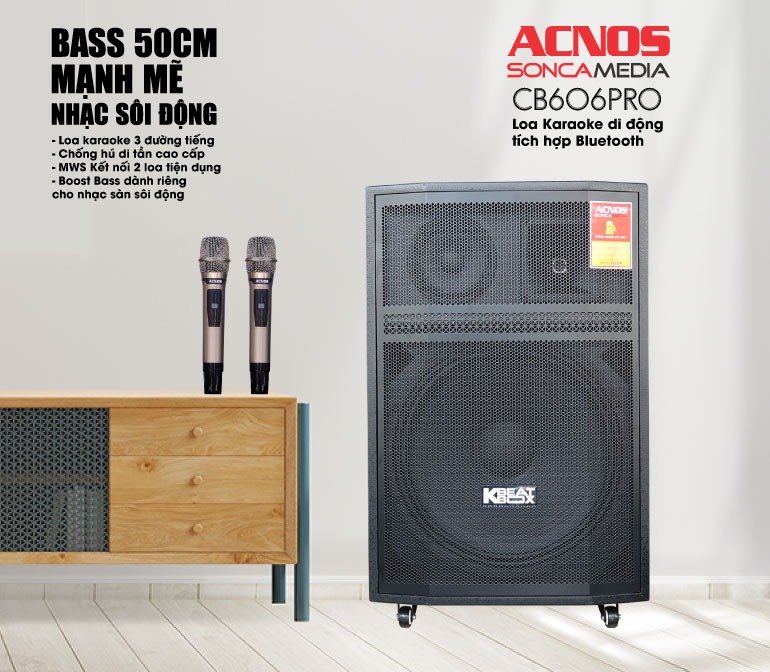 ACNOS CB606PRO bên ngoài được làm bằng chất liệu gỗ, mặt lưới bằng thép phủ một lớp sơn màu đen chống han gỉ. Hệ thống loa bao gồm 1 loa Bass 5 tấc (50cm), 1 loa Trung 16cm và 1 loa Treble cho âm thanh mạnh mẽ, trầm ấm. Phù hợp với không gian trong nhà, sân vườn hoặc các buổi dã ngoại, team building ngoài trời. Loa karaoke CB606PR0 có công suất RMS 200W tương đương công suất âm thanh PMPO lên đến 850W.