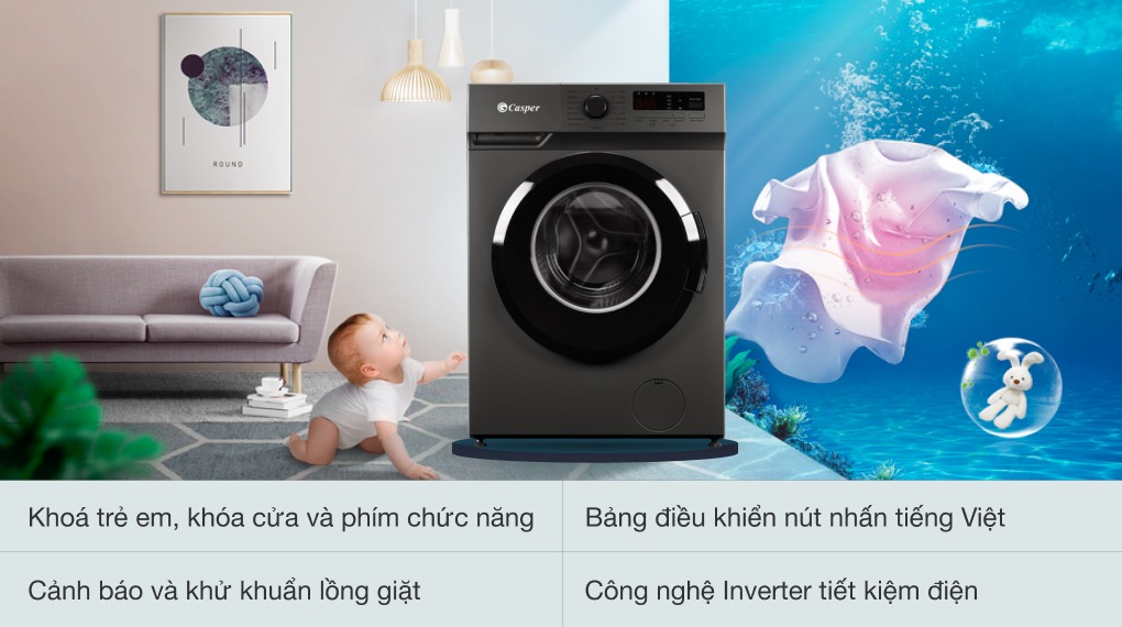 - Máy giặt Casper Inverter 10.5 kg WF-105VG5 là loại máy giặt lồng ngang - cửa trước. Thiết kế chủ đạo màu đen - xám trung tính nên dễ phối hợp với nhiều phong cách nội thất.