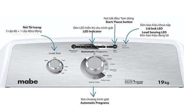 - Máy giặt quần áo Mabe có hiệu suất cao, cùng khối lượng giặt lớn lên đến 19 kg, cho phép giặt được nhiều đồ hơn so với các dòng máy giặt thông thường, đáp ứng tốt nhu cầu giặt lớn và thường xuyên.