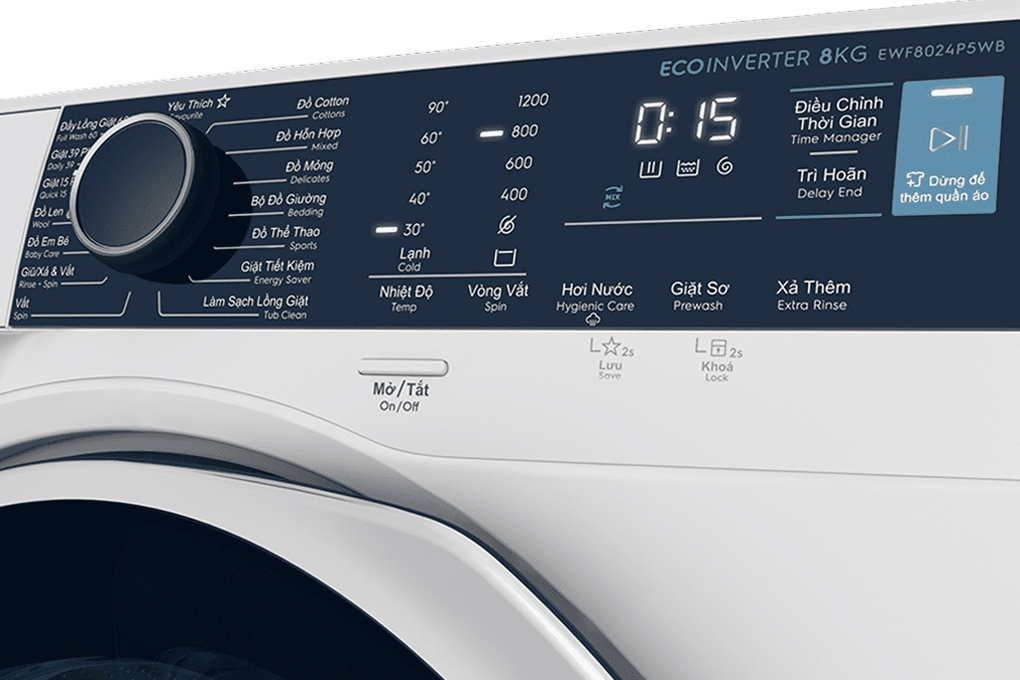 - Máy giặt Electrolux EWF8024P5WB được thiết kế với 15 chương trình giặt đa dạng như: Chế độ yêu thích, giặt chăn ga, giặt nhanh 15 phút, giặt nhanh 39 phút, giặt tiết kiệm, làm đầy lồng giặt 60 phút, vắt, vệ sinh lồng giặt, xả + vắt, đồ cotton, đồ hỗn hợp, đồ len, đồ mỏng, đồ thể thao, đồ trẻ em. Máy giặt Electrolux sẽ giúp bạn linh hoạt sử dụng các chế độ phù hợp với lượng quần áo hàng ngày cũng như chất liệu vải.