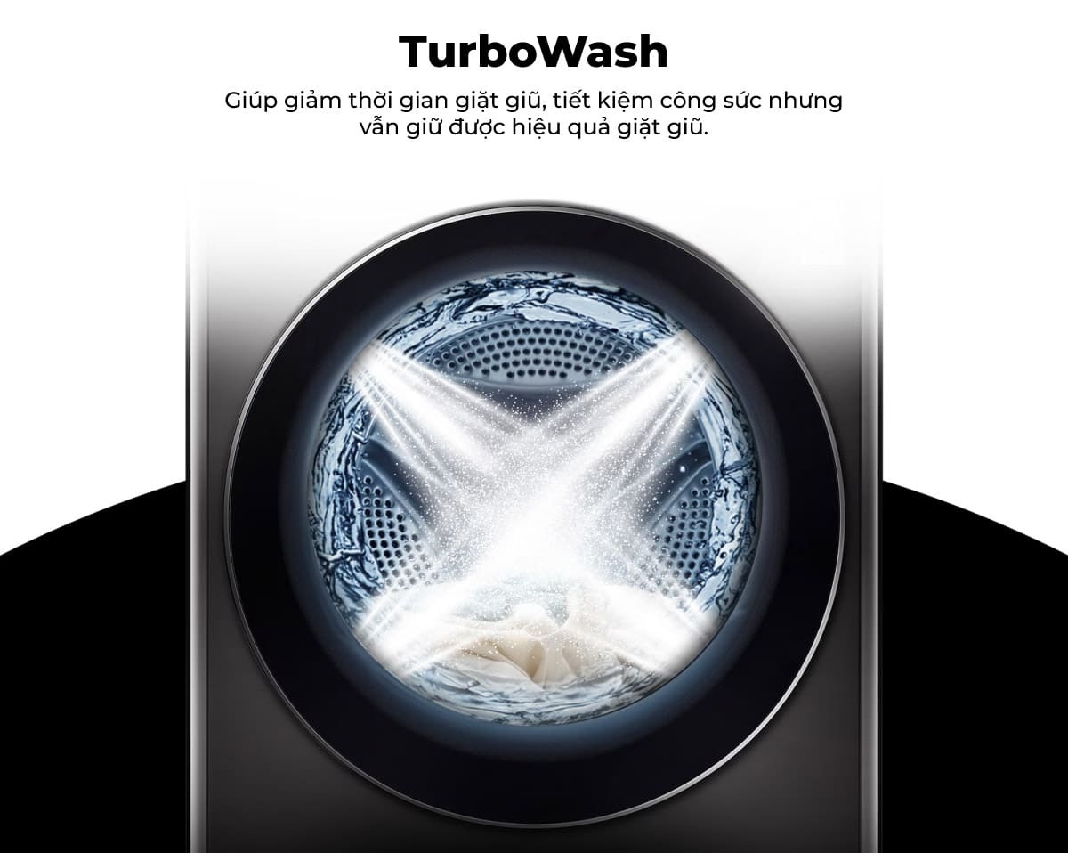 - Công nghệ giặt tiết kiệm TurboWash giặt sạch nhanh chóng, tiết kiệm thời gian giặt giũ. Nhờ sử dụng hai vòi xả nước tốc độ nhanh và mạnh, giúp các phân tử nước có thể thẩm thấu và đánh tan các bụi bẩn trong thời gian nhanh hơn. Ở chế độ xả vải, máy giặt xả sạch và nhanh hơn nhờ dòng nước áp lực cao. Bên cạnh đó, máy giặt còn quay với tốc độ quay cao hơn, mang đến thời gian giặt nhanh hơn.