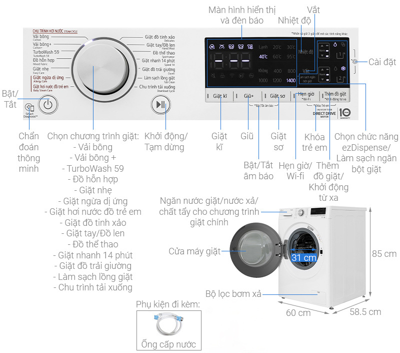 | Công nghệ giặt | Công nghệ AI DD bảo vệ sợi vải Công nghệ giặt hơi nước Steam (cửa trước) Công nghệ giặt tiết kiệm TurboWash |