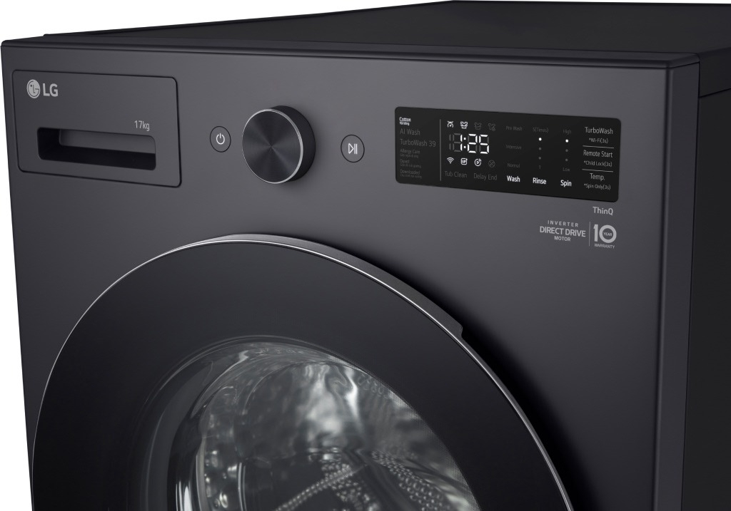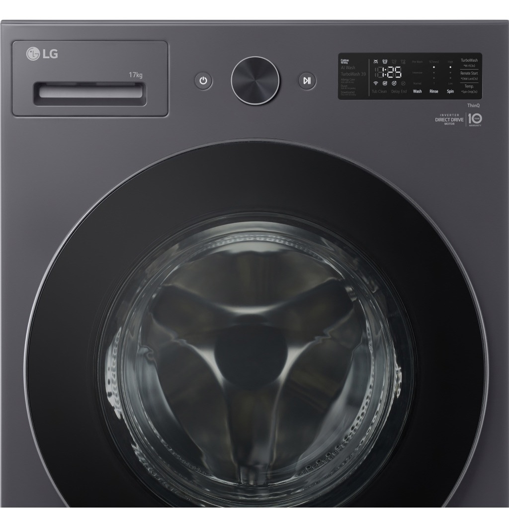 - Máy giặt LG lồng ngang AI DD Inverter 17Kg F2517SNTG với thiết kế cửa ngang hiện đại, chắc chắn và máy có tông màu đen sang trọng, tạo điểm nhấn cho không gian phòng giặt nhà bạn.
