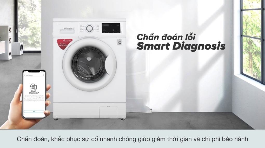 - Là một chiếc máy giặt hiện đại, máy giặt LG FM1209N6W được hãng tích hợp tính năng chẩn đoán thông minh Smart diagnosis. Nhờ vậy bạn có thể chẩn đoán lỗi của máy giặt chỉ bằng một chiếc smartphone ngay tại nhà vô cùng tiện lợi.