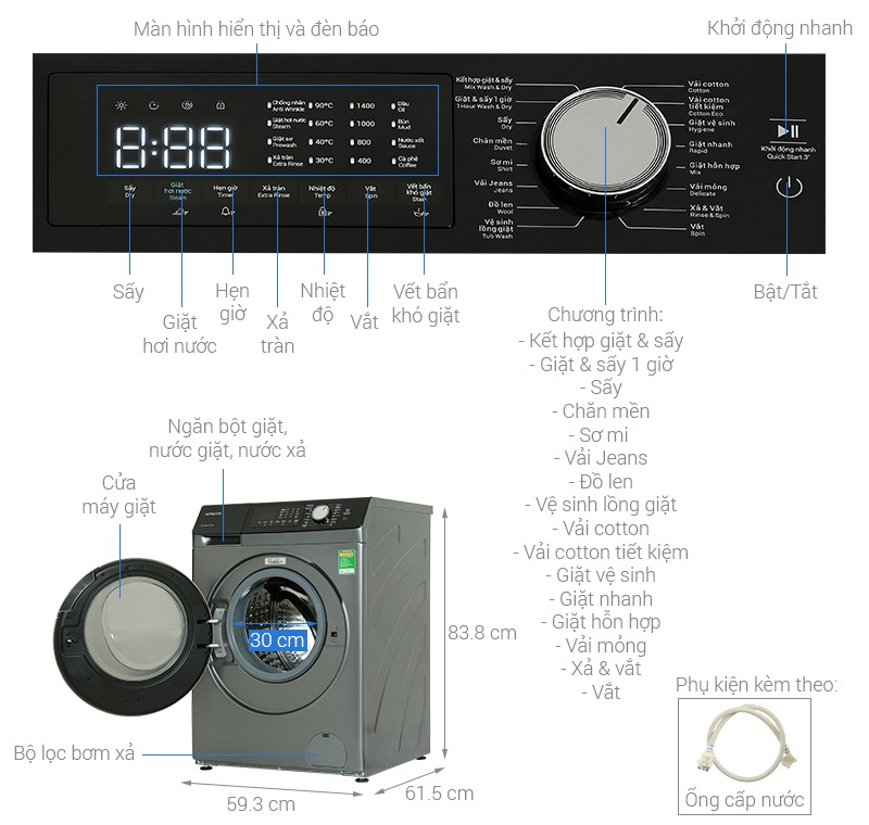 | Tiện ích | Vệ sinh lồng giặt Khóa trẻ em Hẹn giờ giặt Chống nhăn Có sấy ngưng tụ |