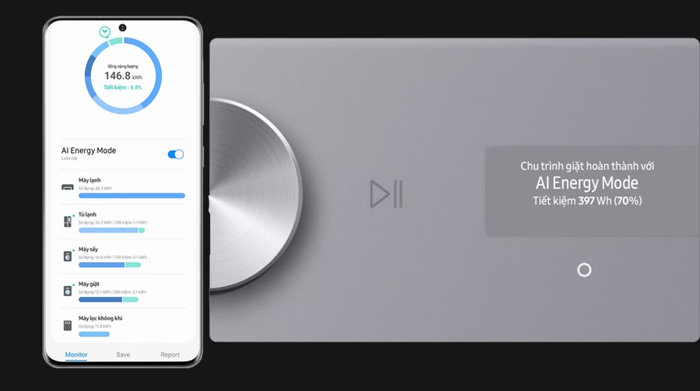 - Đặc biệt, máy giặt Samsung 11 kg này được trang bị bảng điều khiển thông minh AI Control. Nó có thể tự động ghi nhớ, phân tích, đề xuất chế độ giặt và cài đặt yêu thích mà bạn không cần phải tùy chỉnh mỗi khi giặt. Vì thế, sản phẩm giảm bớt thao tác cài đặt máy cho bạn khi sử dụng, nhất là phù hợp cho những người bận rộn hoặc những ai không rành về công nghệ như người lớn tuổi.