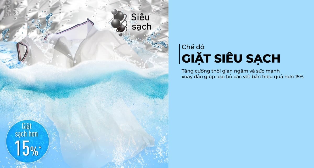 - Với chế độ giặt siêu sạch, Máy Giặt Panasonic 10 Kg NA-F10S10BRV sẽ tăng cường thời gian ngâm và tốc độ xoay đảo chiều mạnh mẽ để loại bỏ hiệu quả các vết bẩn cứng đầu. Nhờ sự thay đổi này mà quần áo được làm sâu, hiệu quả hơn 15 % so với chế độ giặt thông thường.