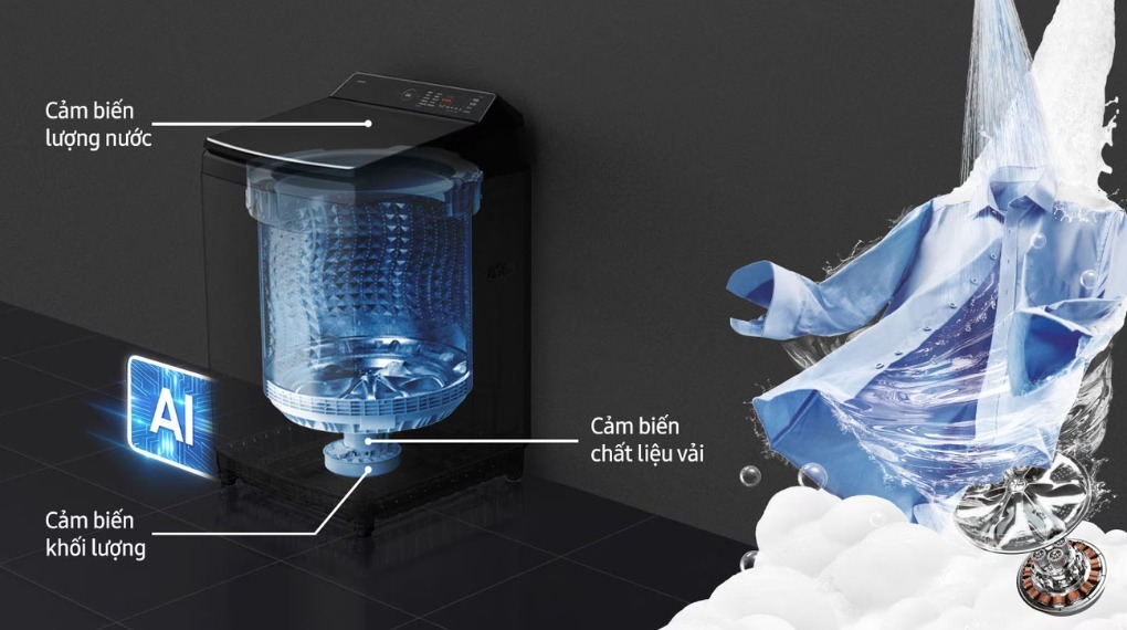 - AI Wash cảm biến chất liệu và khối lượng quần áo, từ đó điều chỉnh chính xác thời gian, lượng nước và chất giặt tẩy phù hợp cho từng mẻ giặt.