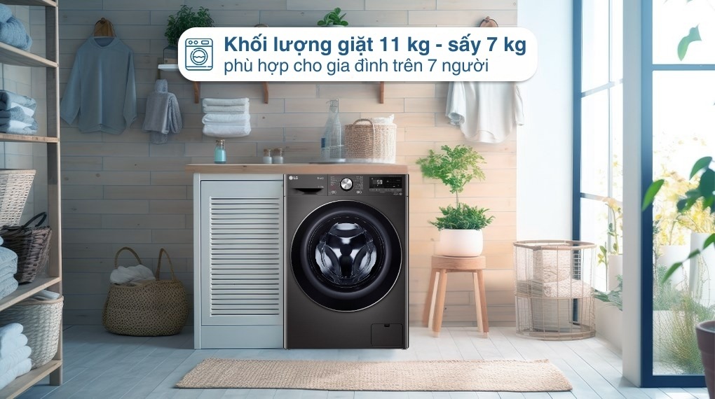 - Máy giặt LG này có khối lượng giặt tối đa 11 kg, sấy 7 kg phù hợp với gia đình trên 7 thành viên, hoặc gia đình ít thành viên hơn nhưng nhu cầu giặt giũ cao, tiết kiệm thời gian phơi đồ.