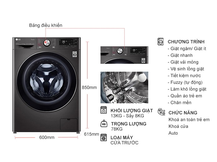 - Máy giặt LG này được tích hợp chức năng sấy quần áo đi kèm, với khối lượng giặt tối đa là 13 kg và sấy 8 kg, máy giặt phù hợp với nhu cầu giặt giũ cho các gia đình có đông thành viên (trên 7 người), không có nhiều thời gian phơi khô quần áo.