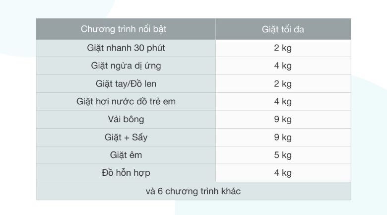 - Sản phẩm có 8 chương trình giặt nổi bật như: giặt nhanh 30 phút, giặt ngừa dị ứng, giặt tay/đồ len, giặt hơi nước trẻ em, vải bông, giặt + sấy, giặt êm, đồ hỗn hợp và 6 chương trình khác giúp việc giặt giũ trở nên dễ dàng tiện lợi (Xem chi tiết tại bảng thông số kĩ thuật). Nổi bật với chương trình giặt nhanh 30 phút, giúp tiết kiệm thời gian và điện năng tiêu thụ hiệu quả khi bạn chỉ có nhu cầu giặt một khối lượng quần áo không nhiều.