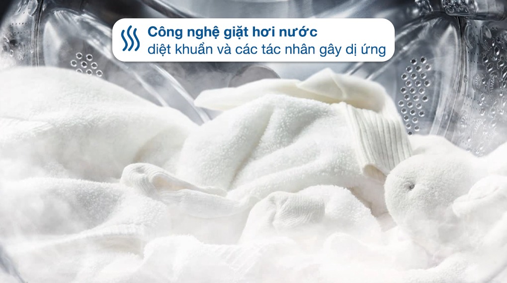 - Máy giặt được tích hợp công nghệ giặt hơi nước Steam, có khả năng dùng hơi nước nóng để thẩm thấu qua từng sợi vải, giúp loại bỏ các tác nhân gây dị ứng bám trên quần áo một cách nhẹ nhàng cũng như khử trùng hiệu quả, bảo vệ làn da tối ưu cho bạn.