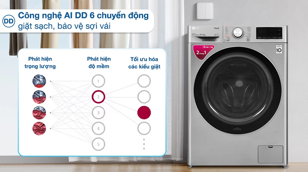 - Ngoài ra, cũng nhờ sử dụng động cơ truyền động trực tiếp - tích hợp trí tuệ nhân tạo AI nên máy giặt sấy này còn có khả năng cảm nhận độ mềm mại của sợi vải bên cạnh phát hiện ra trọng lượng của quần áo, giúp tối ưu hóa chương trình, góp phần làm giảm sự hư tổn của sợi vải trong quá trình giặt.