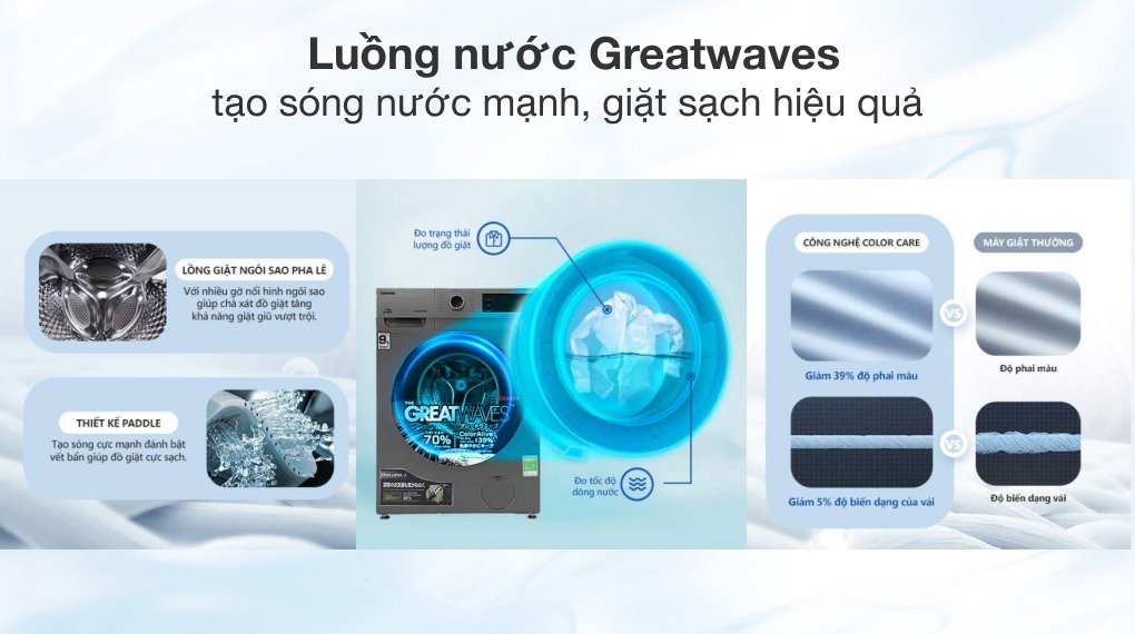 - Công nghệ Greatwaves tạo ra sức mạnh siêu sóng đánh bật mọi vết bẩn cứng đầu trên từng thớ vải