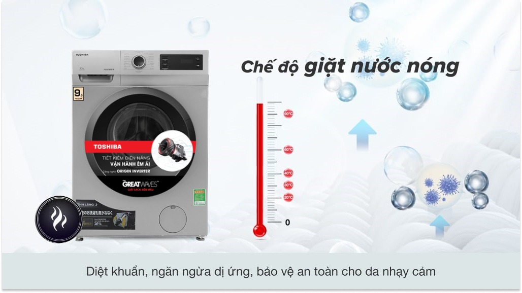 - Giặt sạch vết bẩn cứng đầu, diệt khuẩn hiệu quả nhờ công nghệ nước nóng