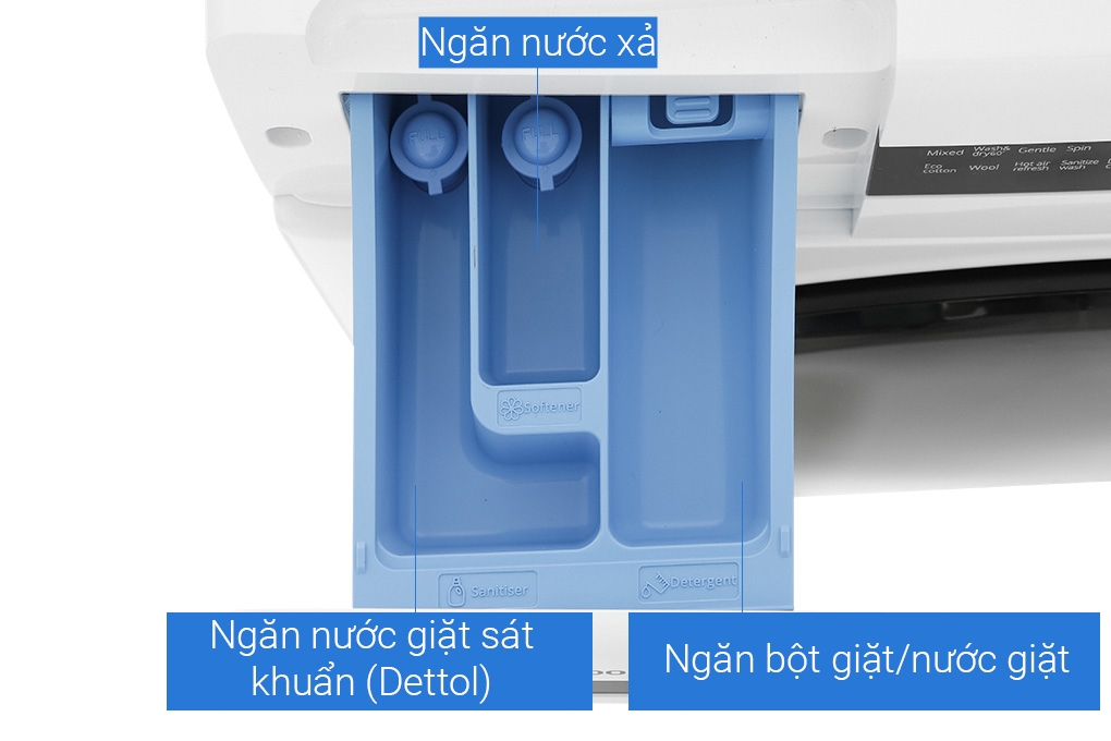 Với khay nước giặt 3 ngăn riêng biệt (bột giặt, nước sát khuẩn, nước làm mềm vải), dòng sản phẩm SaniCare kết hợp cả nước sát khuẩn và nước làm mêm vải vào chu trình xả, khử trùng hiệu quả quần áo của bạn, mang lại mức độ vệ sinh cao trong mỗi lần giặt, đồng thời giữ cho quần áo luôn tươi mới và mềm mại sau thời gian sử dụng lâu dài