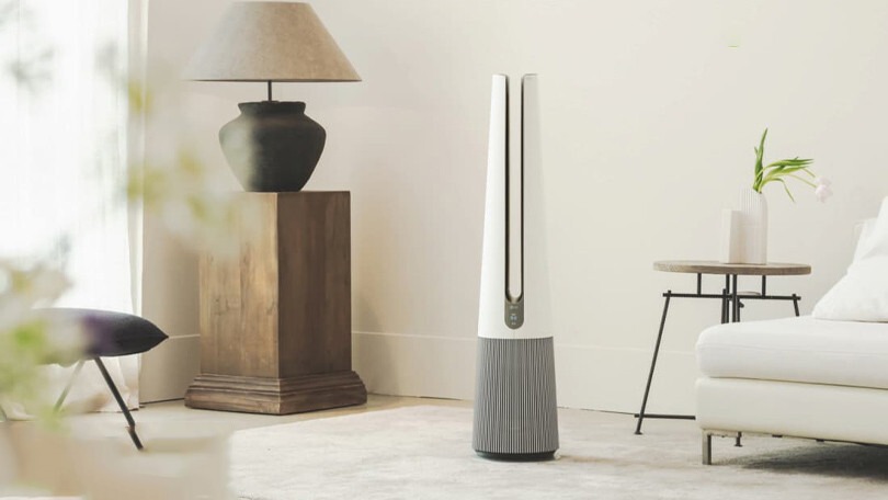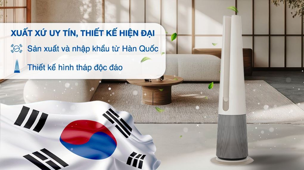 - Máy lọc không khí kết hợp quạt LG PuriCare AeroTower FS15GPCJ0.ABAE thiết kế hiện đại, kết hợp lọc không khí, quạt mát và sưởi ấm