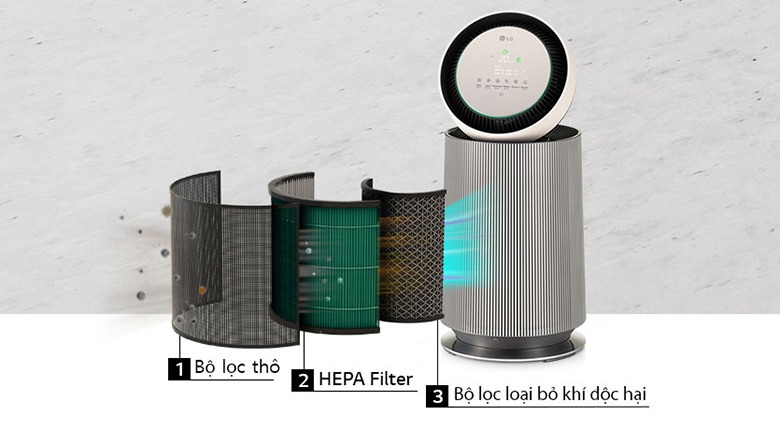 - Hệ thống lọc đa màng bao gồm 3 lớp bao gồm màng lọc thô, màng lọc HEPA và màng lọc than hoạt tính. Hệ thống này giúp thu giữ và loại bỏ 99.999% các hạt bụi mịn - vi khuẩn, vi-rút, bụi, chất gây dị ứng và các thành phần gây mùi khó chịu.