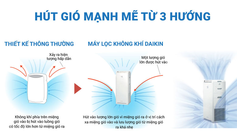 Máy lọc không khí với thiết kế 3 miệng hút gió (phía trước - bên trái - bên phải), cho phép hút vào một lượng lớn không khí, từ đó nhanh chóng làm sạch không khí trong phòng, gia tăng hiệu suất lọc khí.