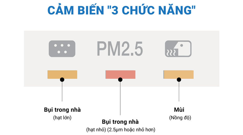 Máy lọc không khí được trang bị cảm biến độ nhạy cao, phát hiện nhanh chóng bụi thô và bụi mịn PM2.5, giúp người dùng theo dõi được mức độ ô nhiễm không khí, từ đó tìm ra phương pháp xử lý phù hợp cho không gian sống của mình. Ngoài ra máy còn lọc được bụi mịn PM0.3.