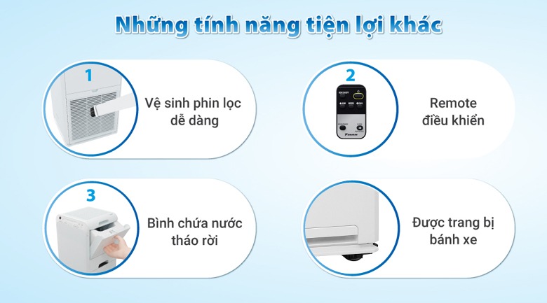 - Có remote điều khiển từ xa: các phím bấm thân thiện, thao tác từ bất kỳ vị trí nào trong phòng, không cần di chuyển lại gần máy.