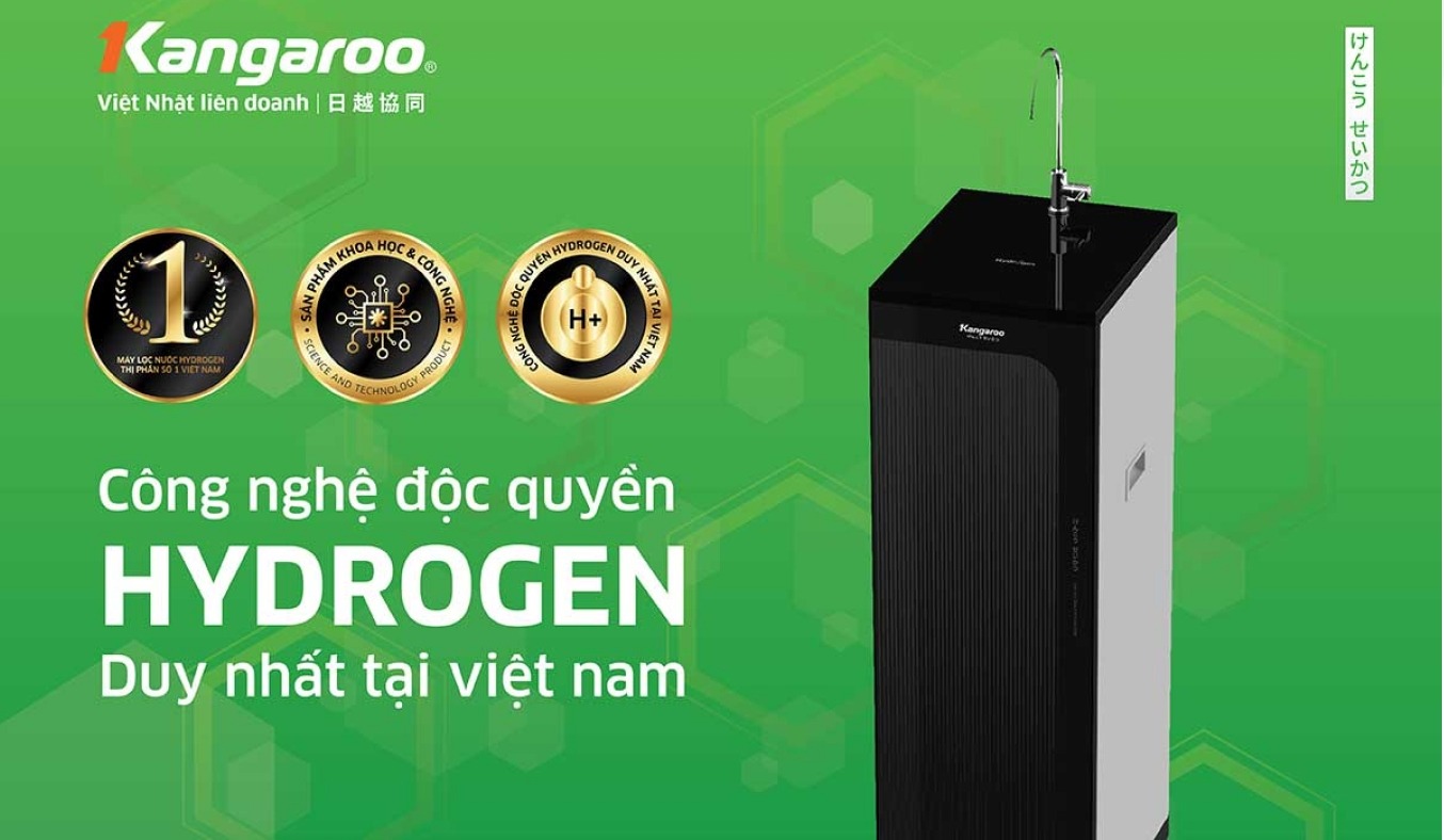 - Kangaroo là thương hiệu có bằng sáng chế độc quyền thiết bị lọc nước Hydrogen. Nước Hydrogen tươi bổ sung vi khoáng tự nhiên và chất điện giải có lợi, giúp tăng cường miễn dịch và nước có vị ngon ngọt tự nhiên. Đồng thời hoạt động như một chất chống oxy giúp loại bỏ gốc tự do có hại, là tác nhân gây lão hóa, các bệnh dạ dày…