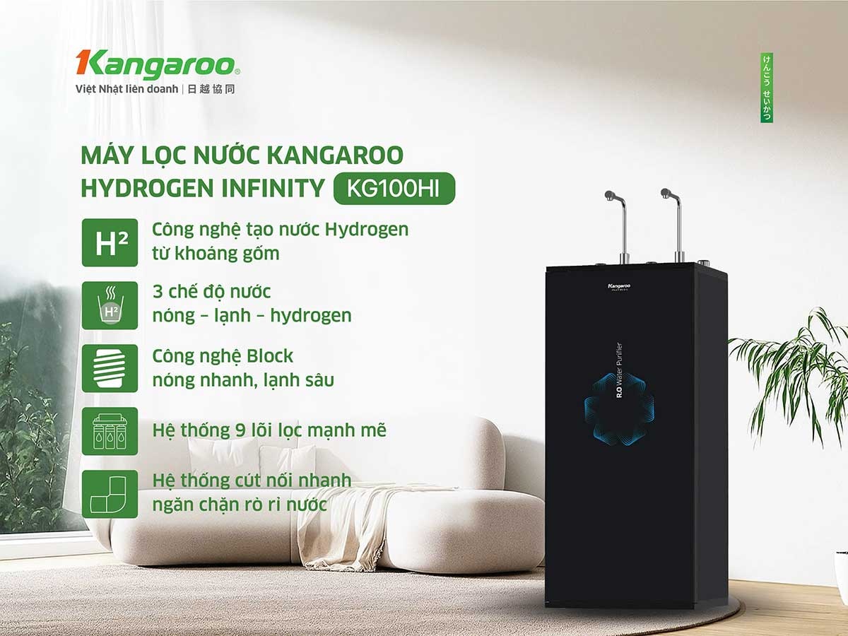 - Kangaroo là thương hiệu có bằng sáng chế độc quyền thiết bị lọc nước Hydrogen. Nước Hydrogen tươi bổ sung vi khoáng tự nhiên và chất điện giải có lợi, giúp tăng cường miễn dịch và nước có vị ngon ngọt tự nhiên. Đồng thời hoạt động như một chất chống oxy giúp loại bỏ gốc tự do có hại, là tác nhân gây lão hóa, các bệnh dạ dày…