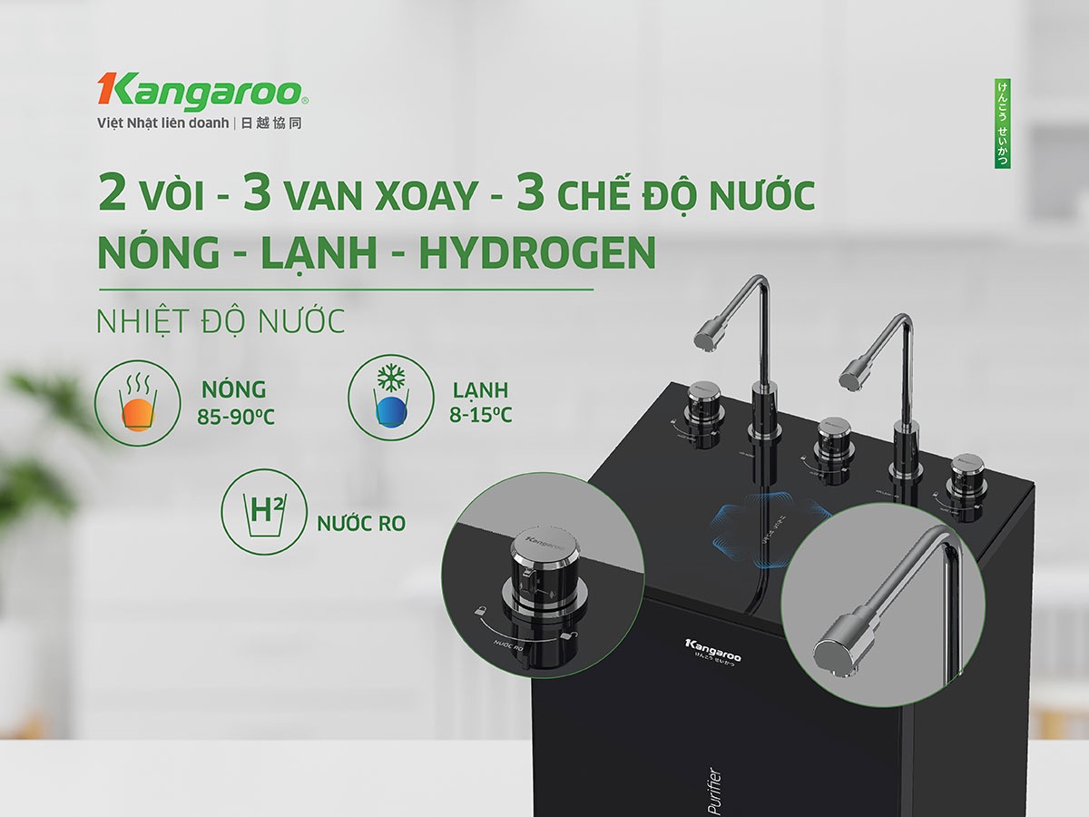 - KG100HI của Kangaroo sử dụng 2 vòi nóng lạnh độc lập, 3 van xoay cơ học tương ứng với 3 chế độ nước nóng – lạnh – hydrogen.