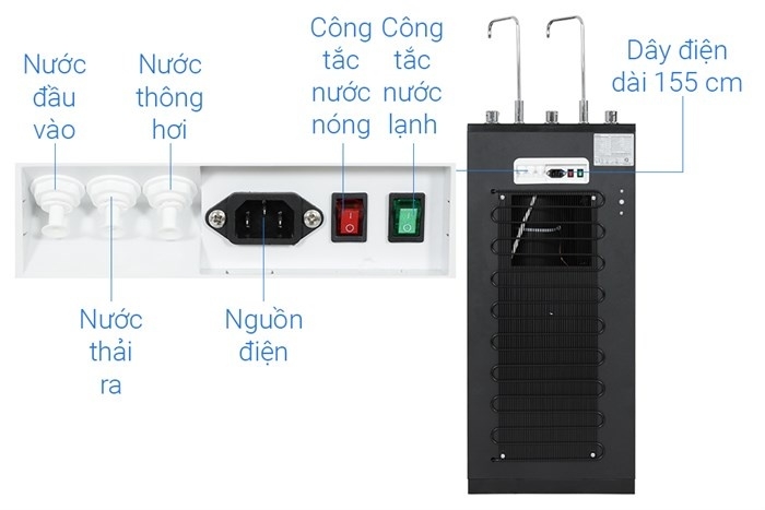 | Chức năng | Lọc RO, tạo nước hydrogen bằng khoáng gốm Tạo nước Nóng - Lạnh |