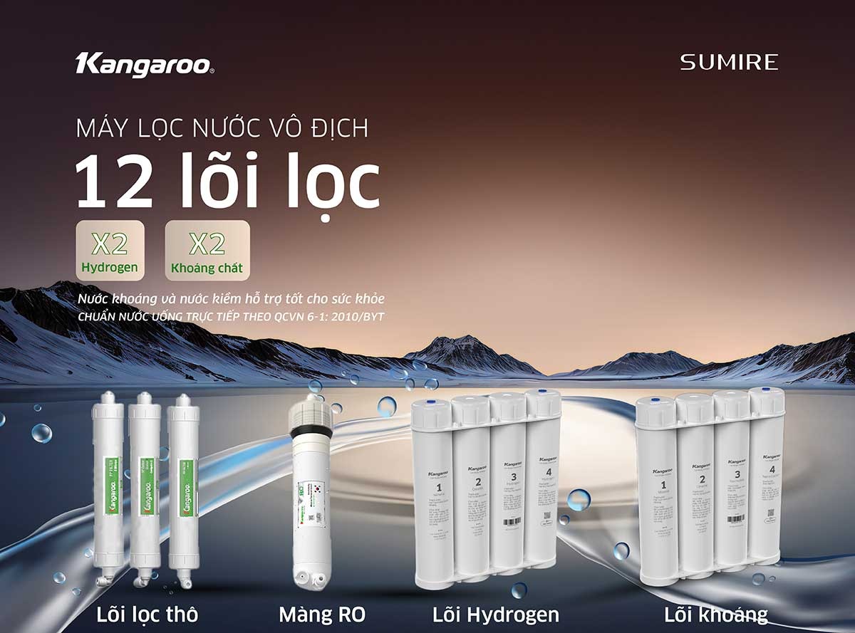 Máy lọc nước Kangaroo Sumire Hydrogen ion kiềm nóng lạnh 12 cấp KGHC12A3 tích hợp hệ thống 12 lõi lọc giúp tăng hiệu suất lọc nước. Các lõi lọc bao gồm: